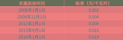 表3:可再生能源電價附加征收標準歷年變化(單位:元/千瓦時)