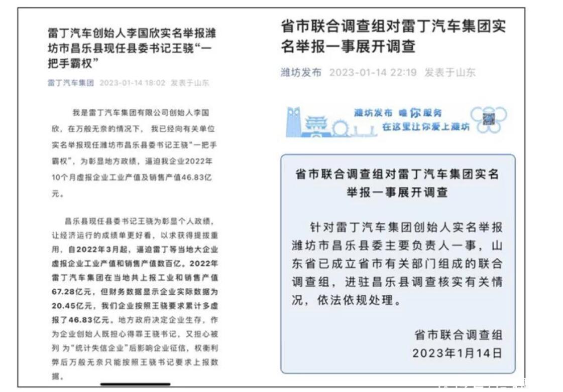 1月14日小年夜,一篇題為《雷丁汽車創(chuàng)始人李國欣實(shí)名舉報(bào)濰坊市昌樂縣現(xiàn)任縣委書記王驍“一把手霸權(quán)”》的文章在各大社交平臺(tái)“刷屏”,該篇文章由“雷丁汽車集團(tuán)”微信公眾號(hào)發(fā)布。同時(shí),雷丁汽車創(chuàng)始人李國欣在雷丁汽車視頻號(hào)發(fā)布了一則時(shí)長約一分鐘的視頻,稱“昌樂縣現(xiàn)任縣委書記王驍逼迫公司提報(bào)虛假統(tǒng)計(jì)數(shù)據(jù)近50億元”。