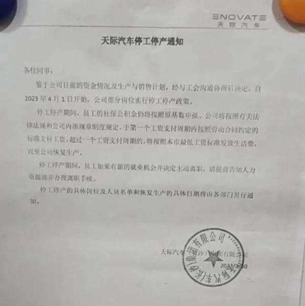 據(jù)天際汽車發(fā)布的停工停產(chǎn)通知,鑒于公司目前的資金情況及生產(chǎn)與銷售計劃,自2023年4月1日開始,公司部分崗位實行停工停產(chǎn)政策。