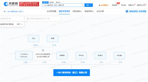 股權(quán)全景穿透圖顯示,該公司由1.8Meters Technology Holding Limited、杭州大井頭貳拾貳號文化藝術(shù)有限公司以及胡曉明等4名自然人共同持股。其中,杭州大井頭貳拾貳號文化藝術(shù)有限公司由馬云持股99.9%;持有一米八海洋科技5.5%股權(quán)并擔(dān)任董事長的胡曉明則曾任螞蟻集團CEO。