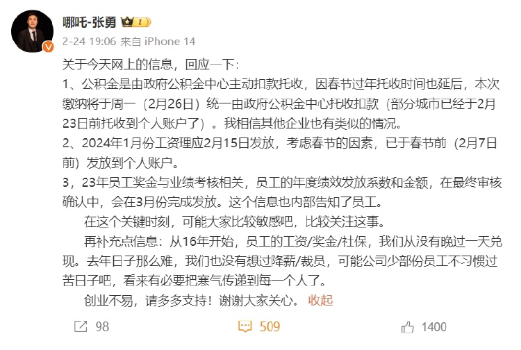 澎湃新聞注意到,春節(jié)復(fù)工后,多位員工在脈脈平臺(tái)爆料稱,此前哪吒汽車的CEO張勇承諾年后上班第一周發(fā)放年終獎(jiǎng)卻并未兌現(xiàn),人事部門(mén)經(jīng)理在群內(nèi)通知稱,年終獎(jiǎng)延遲到3月發(fā)放。該事經(jīng)發(fā)酵后,張勇在個(gè)人微博進(jìn)行了回應(yīng)。