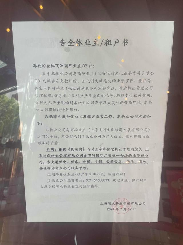 值得注意的是,鴻成物業(yè)與飛洲文旅此前已經(jīng)存在經(jīng)濟糾紛。記者辦公樓下看到,鴻成物業(yè)7月19日發(fā)布了一份“告全體業(yè)主/租戶書”,上面寫著,鴻成物業(yè)與飛洲文旅之間存在欠款糾紛,如飛洲文旅拖欠物業(yè)費、能耗費,并拒絕支付相關費用,鴻成物業(yè)將進行依法維權。