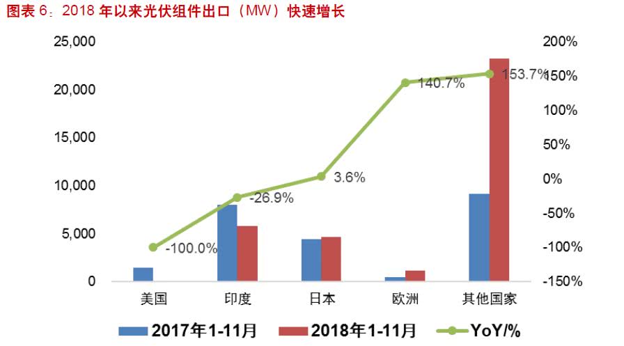 中國光伏行業(yè)協(xié)會的數(shù)據(jù)顯示,2018年光伏產(chǎn)品(硅片、電池片、組件)出口總額達(dá)161.1億美元,創(chuàng)下歐美“雙反”后最高水平,同比增長10.9%。組件市場方面,光伏市場出口集中度繼續(xù)下降,形成傳統(tǒng)市場和新興市場(南美、中東北非)結(jié)合的多元化市場傳統(tǒng)市場方面,因歐盟取消了長達(dá)五年的“雙反”政策,歐洲市場復(fù)蘇,對荷蘭、德國、英國等歐洲主要國家的組件出口同比增長,對烏克蘭、西班牙的組件出口大幅增長。中國光伏行業(yè)協(xié)會預(yù)測,歐盟市場2019年增速明顯增高,可達(dá)11GW,西班牙等啟動平價(jià)上網(wǎng)項(xiàng)目,法國、荷蘭、意大利等也將有較大幅度增長。