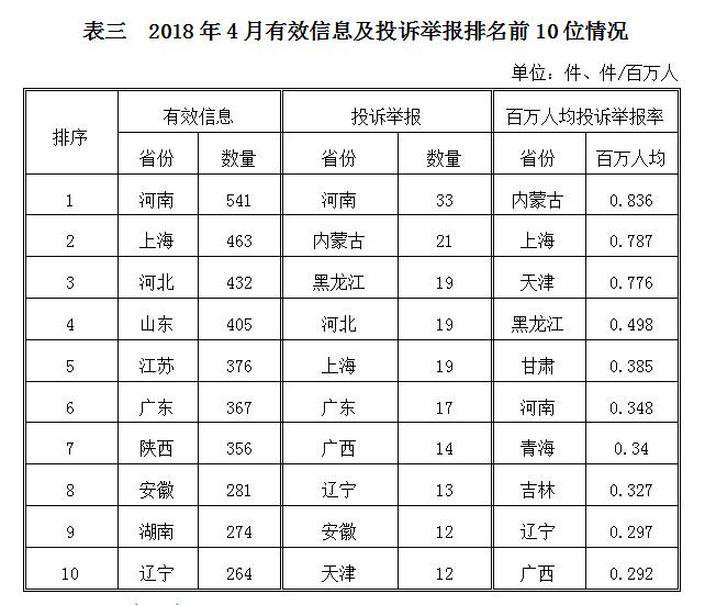 2018年4月,各省(自治區(qū)、直轄市)按照有效信息數(shù)量排序,河南、上海、河北等?。ㄊ校┝腥珖?guó)前10位;按照投訴舉報(bào)數(shù)量排序,河南、內(nèi)蒙古、黑龍江等?。ㄗ灾螀^(qū))排在全國(guó)前10位;按照百萬(wàn)人均投訴舉報(bào)率排序,內(nèi)蒙古、上海、天津等省(市、自治區(qū))位于全國(guó)前10位。(2018年4月有效信息及投訴舉報(bào)排名前10位情況見(jiàn)表三)