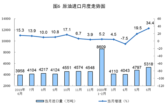 原油進口快速增長,國際原油價格大幅回升。6月份,進口原油5318萬噸,同比增長34.4%。上半年,進口原油2.69億噸,同比增長9.9%,比一季度加快4.9個百分點。6月30日布倫特原油現(xiàn)貨離岸價格為41.64美元/桶,比5月29日的34.15美元/桶回升21.9%。