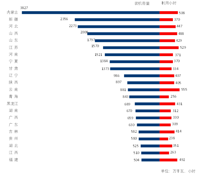 圖3 1-2月份風電裝機較多省份風電裝機容量和設備利用小時