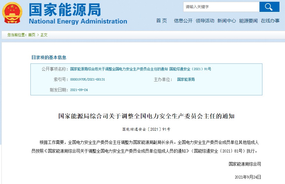 國(guó)家能源局綜合司關(guān)于調(diào)整全國(guó)電力安全生產(chǎn)委員會(huì)主任的通知