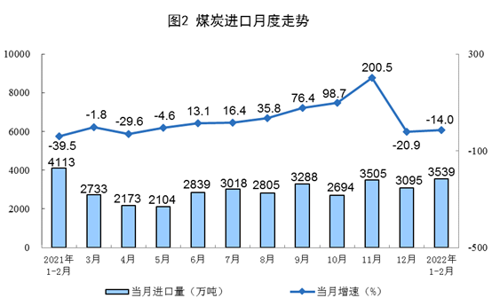 原煤生產(chǎn)較快增長,進(jìn)口降幅收窄。1—2月份,生產(chǎn)原煤6.9億噸,同比增長10.3%,增速比上年12月份加快3.1個(gè)百分點(diǎn),日均產(chǎn)量1164萬噸。進(jìn)口煤炭3539萬噸,同比下降14.0%,降幅比上年12月份收窄6.9個(gè)百分點(diǎn)。