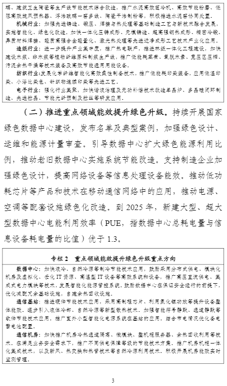 計劃提出,到2025年,重點工業(yè)行業(yè)能效全面提升,數(shù)據(jù)中心等重點領域能效明顯提升,綠色低碳能源利用比例顯著提高,節(jié)能提效工藝技術裝備廣泛應用,標準、服務和監(jiān)管體系逐步完善,鋼鐵、石化化工、有色金屬、建材等行業(yè)重點產(chǎn)品能效達到國際先進水平,規(guī)模以上工業(yè)單位增加值能耗比2020年下降13.5%。能盡其用、效率至上成為市場主體和公眾的共同理念和普遍要求,節(jié)能提效進一步成為綠色低碳的“第一能源”和降耗減碳的首要舉措。