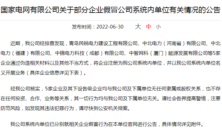 本網(wǎng)訊 6月30日,國(guó)家電網(wǎng)官網(wǎng)發(fā)布“國(guó)家電網(wǎng)有限公司關(guān)于部分企業(yè)假冒公司系統(tǒng)內(nèi)單位有關(guān)情況的公告”。