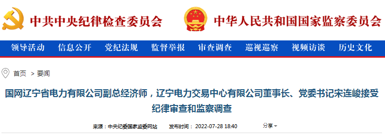 本網(wǎng)訊 中央紀委國家監(jiān)委網(wǎng)站7月28日消息,據(jù)中央紀委國家監(jiān)委駐國家電網(wǎng)有限公司紀檢監(jiān)察組、遼寧省紀委監(jiān)委消息:國網(wǎng)遼寧省電力有限公司副總經(jīng)濟師,遼寧電力交易中心有限公司董事長、黨委書記宋連峻涉嫌嚴重違紀違法,目前正接受中央紀委國家監(jiān)委駐國家電網(wǎng)有限公司紀檢監(jiān)察組紀律審查和朝陽市監(jiān)察委員會監(jiān)察調(diào)查。
