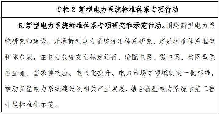 ——建立完善以光伏、風(fēng)電為主的可再生能源標(biāo)準(zhǔn)體系,研究建立支撐新型電力系統(tǒng)建設(shè)的標(biāo)準(zhǔn)體系,加快完善新型儲(chǔ)能標(biāo)準(zhǔn)體系,有力支撐大型風(fēng)電光伏基地、分布式能源等開(kāi)發(fā)建設(shè)、并網(wǎng)運(yùn)行和消納利用。