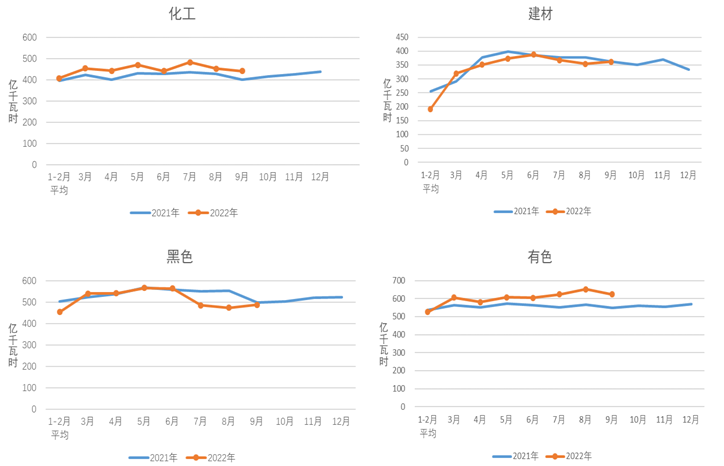 9月份,化工行業(yè)用電量441億千瓦時,同比增長6.2%;建材行業(yè)用電量362億千瓦時,同比下降0.7%;黑色金屬冶煉行業(yè)用電量487億千瓦時,同比下降3.0%;有色金屬冶煉行業(yè)用電量624億千瓦時,同比增長5.1%。