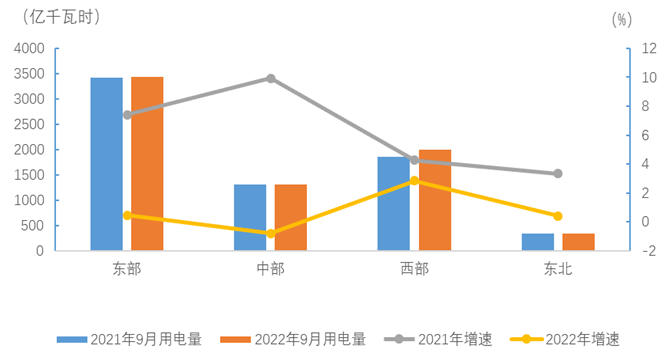 9月份,東、中、西部和東北地區(qū)全社會用電量增速分別為0.5%、-0.8%、2.9%和0.4%。