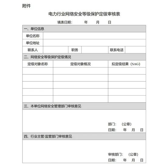 第九條 電力企業(yè)辦理網(wǎng)絡(luò)安全等級(jí)保護(hù)定級(jí)審核手續(xù)時(shí),應(yīng)當(dāng)提交《電力行業(yè)網(wǎng)絡(luò)安全等級(jí)保護(hù)定級(jí)審核表》(詳見附件),含各定級(jí)對象的定級(jí)報(bào)告及專家評(píng)審意見。