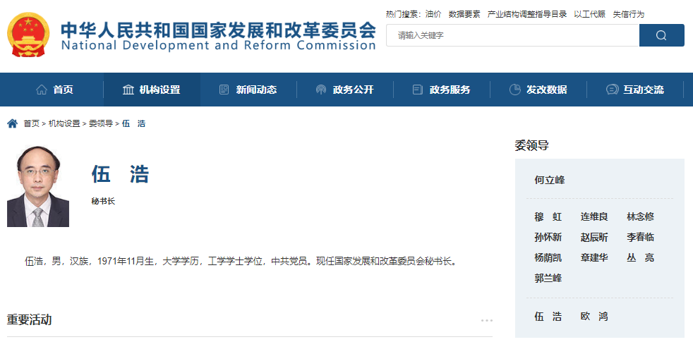 據(jù)國家發(fā)改委官方網(wǎng)站“委領(lǐng)導(dǎo)”欄目最新名單顯示,伍浩已任國家發(fā)改委秘書長。