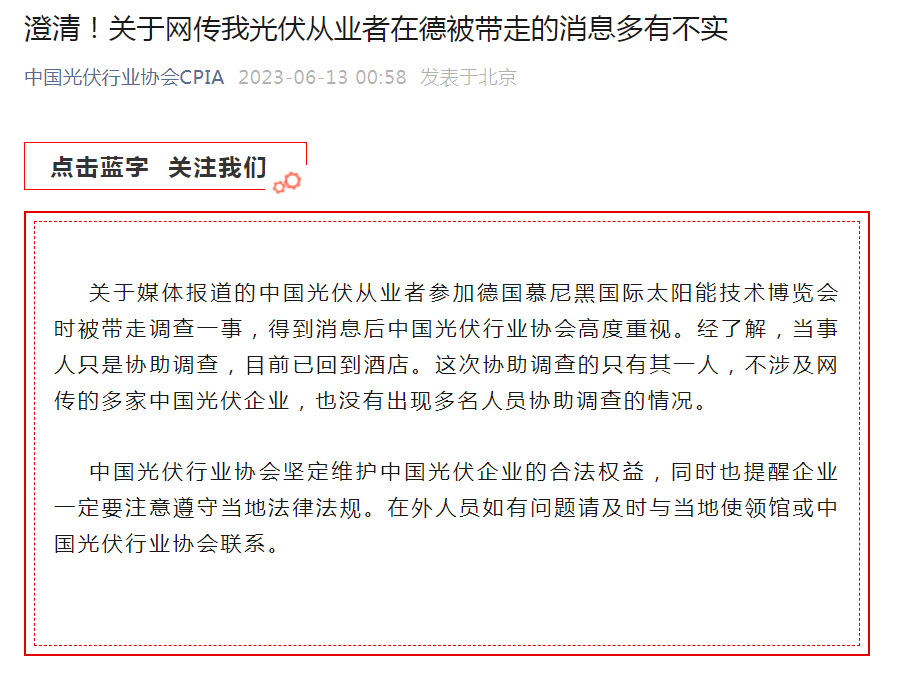 據(jù)“中國光伏行業(yè)協(xié)會CPIA”微信公眾號13日消息,關(guān)于媒體報道的中國光伏從業(yè)者參加德國慕尼黑國際太陽能技術(shù)博覽會時被帶走調(diào)查一事,得到消息后中國光伏行業(yè)協(xié)會高度重視。經(jīng)了解,當事人只是協(xié)助調(diào)查,目前已回到酒店。這次協(xié)助調(diào)查的只有其一人,不涉及網(wǎng)傳的多家中國光伏企業(yè),也沒有出現(xiàn)多名人員協(xié)助調(diào)查的情況。