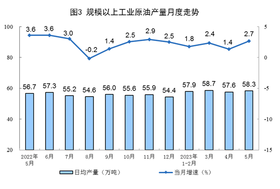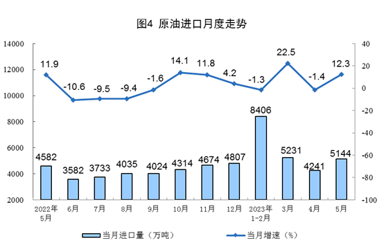 原油生產有所加快,進口由降轉增。5月份,生產原油1807萬噸,同比增長2.7%,增速比4月份加快1.3個百分點,日均產量58.3萬噸。進口原油5144萬噸,同比增長12.3%,4月份為下降1.4%。