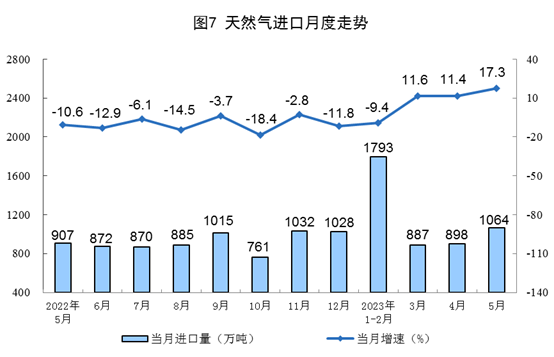 1—5月份,生產天然氣973億立方米,同比增長5.3%。進口天然氣4629萬噸,同比增長3.3%。