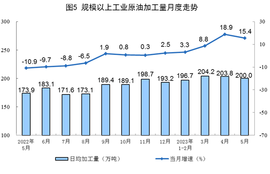 原油加工保持較快增長,增速有所回落。5月份,加工原油6200萬噸,同比增長15.4%,增速比4月份回落3.5個百分點,日均加工原油200.0萬噸。1—5月份,加工原油30263萬噸,同比增長9.8%。