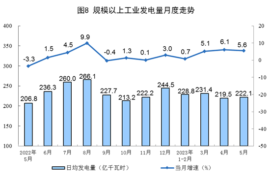 電力生產增速略有回落。5月份,發(fā)電6886億千瓦時,同比增長5.6%,增速比4月份回落0.5個百分點,日均發(fā)電222.1億千瓦時。1—5月份,發(fā)電34216億千瓦時,同比增長3.9%。