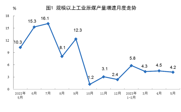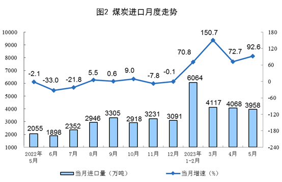 原煤生產保持穩(wěn)定,進口持續(xù)高位增長。5月份,生產原煤3.9億噸,同比增長4.2%,增速比4月份放緩0.3個百分點,日均產量1243萬噸。進口煤炭3958萬噸,同比增長92.6%,增速比4月份加快19.9個百分點。