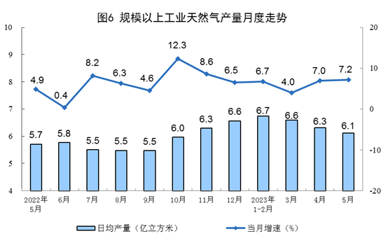 天然氣生產穩(wěn)步增長,進口增速加快。5月份,生產天然氣190億立方米,同比增長7.2%,增速比4月份加快0.2個百分點,日均產量6.1億立方米。進口天然氣1064萬噸,同比增長17.3%,增速比4月份加快5.9個百分點。