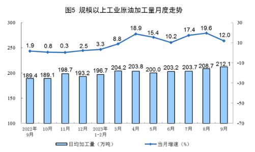 原油加工保持較快增長。9月份,加工原油6362萬噸,同比增長12.0%,增速比8月份回落7.6個(gè)百分點(diǎn),日均加工原油212.1萬噸。1—9月份,加工原油55484萬噸,同比增長11.5%。