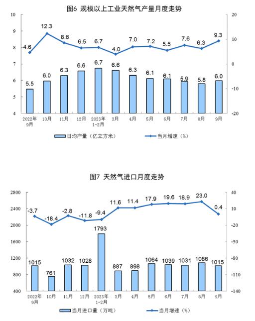 天然氣生產(chǎn)增速加快,進(jìn)口保持平穩(wěn)。9月份,生產(chǎn)天然氣179億立方米,同比增長9.3%,增速比8月份加快3.0個(gè)百分點(diǎn),日均產(chǎn)量6.0億立方米。進(jìn)口天然氣1015萬噸,同比增長0.4%,增速比8月份回落22.6個(gè)百分點(diǎn)。