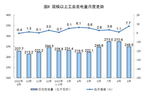 電力生產(chǎn)增速加快。9月份,發(fā)電量7456億千瓦時(shí),同比增長7.7%,增速比8月份加快6.6個(gè)百分點(diǎn),日均發(fā)電248.5億千瓦時(shí)。1—9月份,發(fā)電量66219億千瓦時(shí),同比增長4.2%。