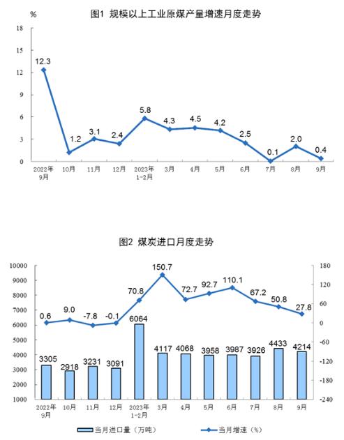 原煤生產(chǎn)保持穩(wěn)定,進(jìn)口快速增長。9月份,生產(chǎn)原煤3.9億噸,同比增長0.4%,增速比8月份放緩1.6個(gè)百分點(diǎn),日均產(chǎn)量1310萬噸。進(jìn)口煤炭4214萬噸,同比增長27.8%,增速比8月份回落23.0個(gè)百分點(diǎn)。