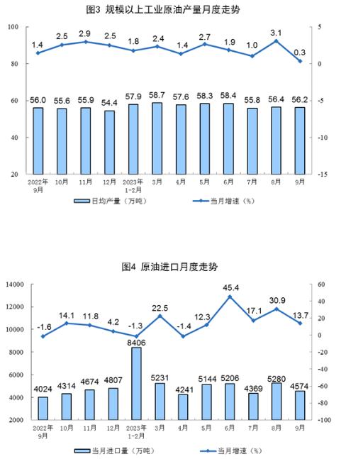 原油生產(chǎn)平穩(wěn)增長,進(jìn)口較快增長。9月份,生產(chǎn)原油1687萬噸,同比增長0.3%,增速比8月份放緩2.8個(gè)百分點(diǎn),日均產(chǎn)量56.2萬噸。進(jìn)口原油4574萬噸,同比增長13.7%,增速比8月份回落17.2個(gè)百分點(diǎn)。