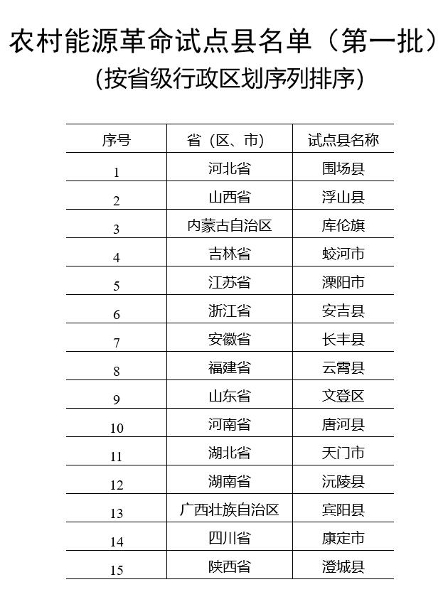 農(nóng)村能源革命是加快農(nóng)村地區(qū)能源清潔低碳轉(zhuǎn)型、實現(xiàn)農(nóng)村能源高質(zhì)量發(fā)展的有力舉措。2018年,國家能源局批復(fù)同意河南省蘭考縣開展全國首個農(nóng)村能源革命試點縣建設(shè),截至目前已在多方面取得積極成效。為進一步推動農(nóng)村能源轉(zhuǎn)型升級和高質(zhì)量發(fā)展,積累改革試點經(jīng)驗,根據(jù)《國家能源局 生態(tài)環(huán)境部 農(nóng)業(yè)農(nóng)村部 國家鄉(xiāng)村振興局關(guān)于組織開展農(nóng)村能源革命試點縣建設(shè)的通知》(國能發(fā)新能〔2023〕23號),經(jīng)地方申報、專家評估和部門審核,確定了第一批15個符合條件的農(nóng)村能源革命試點縣(見附件),現(xiàn)予以公布并就有關(guān)工作要求通知如下: