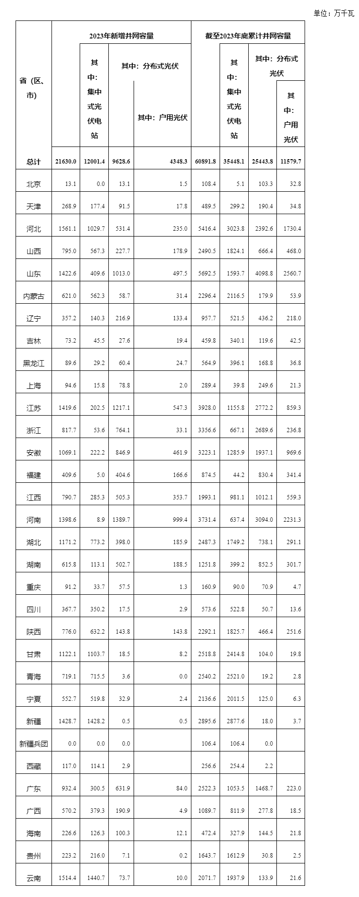 截至2023年底累計并網(wǎng)容量60891.8萬千瓦,其中集中式光伏電站35448.1萬千瓦,分布式光伏電站25443.8萬千瓦,戶用光伏11579.7萬千瓦。