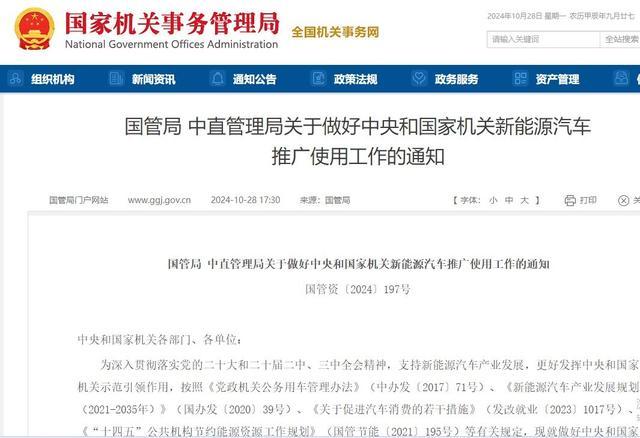 10月28日,據(jù)國家機關事務管理局網(wǎng)站消息,國管局、中直管理局日前聯(lián)合印發(fā)《關于做好中央和國家機關新能源汽車推廣使用工作的通知》,旨在支持新能源汽車產(chǎn)業(yè)發(fā)展,更好發(fā)揮中央和國家機關示范引領作用。