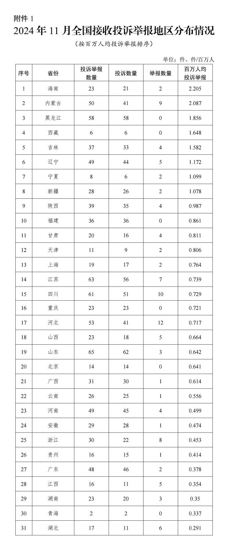 各省(自治區(qū)、直轄市)按照接收投訴舉報數(shù)量排序,山東、江蘇、四川、黑龍江、河北排在全國前5位。按百萬人均投訴舉報數(shù)量排序,海南,內(nèi)蒙,黑龍江,西藏,吉林排在全國前5位。(2024年11月全國接收投訴舉報地區(qū)分布情況見附件1)