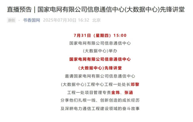 7月30日《書(shū)香國(guó)網(wǎng)》公眾號(hào)先鋒講堂直播預(yù)告推文顯示,國(guó)家電網(wǎng)有限公司信息通信中心(大數(shù)據(jù)中心)這一機(jī)構(gòu)名稱(chēng)首次出現(xiàn)。