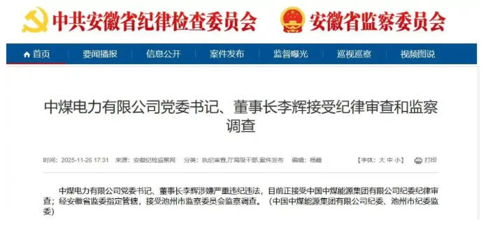 據(jù)安徽紀(jì)檢監(jiān)察網(wǎng)11月26日消息,中煤電力有限公司黨委書記、董事長李輝涉嫌嚴(yán)重違紀(jì)違法,目前正接受中國中煤能源集團(tuán)有限公司紀(jì)委紀(jì)律審查;經(jīng)安徽省監(jiān)委指定管轄,接受池州市監(jiān)察委員會監(jiān)察調(diào)查。