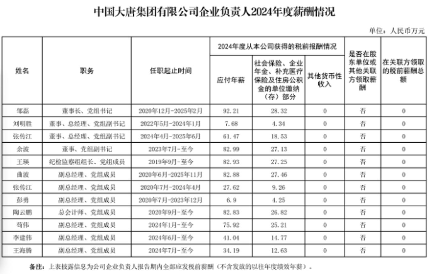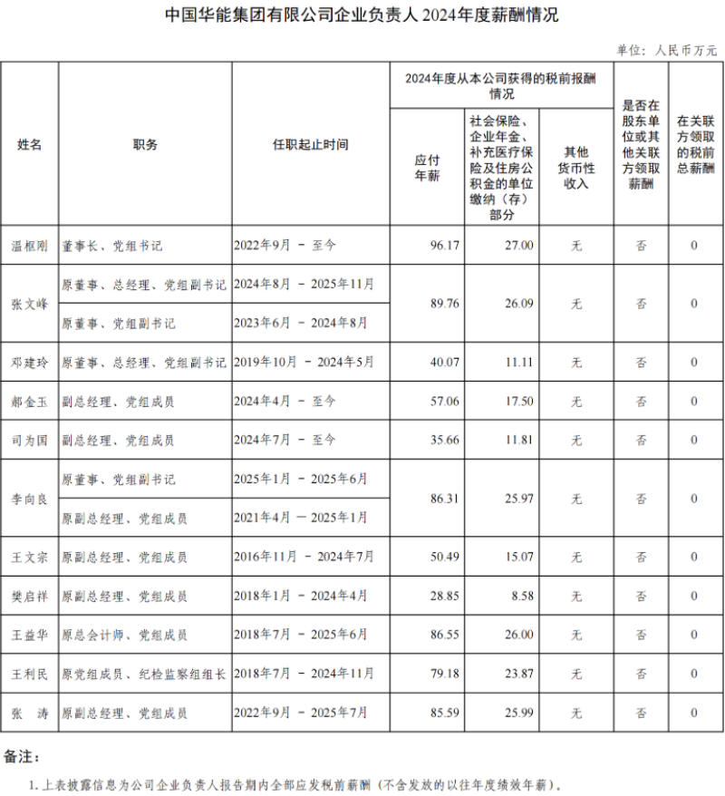 五大發(fā)電集團(tuán)負(fù)責(zé)人2024年度薪酬
