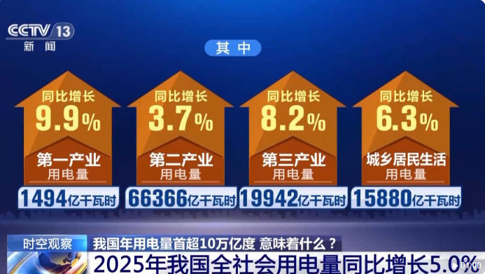 數(shù)據(jù)顯示,2025年,全社會(huì)用電量累計(jì)103682億千瓦時(shí),同比增長(zhǎng)5.0%。其中: