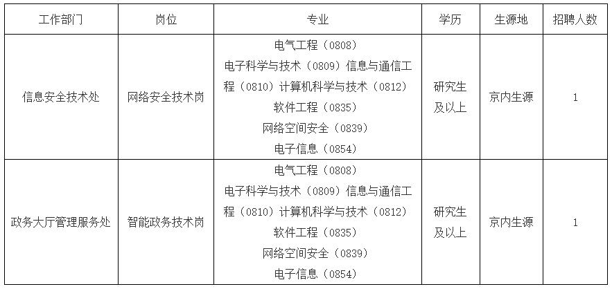 2.政務(wù)大廳管理服務(wù)處:智能政務(wù)技術(shù)崗工作人員1名(京內(nèi)生源研究生及以上應(yīng)屆畢業(yè)生)。專業(yè)為電氣工程(0808)、電子科學(xué)與技術(shù)(0809)、信息與通信工程(0810)、計算機科學(xué)與技術(shù)(0812)、軟件工程(0835)、網(wǎng)絡(luò)空間安全(0839)、電子信息(0854)。要求作風(fēng)正派、嚴(yán)謹(jǐn)細(xì)致、踏實肯干,責(zé)任心強、執(zhí)行力強、服務(wù)意識強,具有較強的溝通協(xié)調(diào)能力和文字功底。