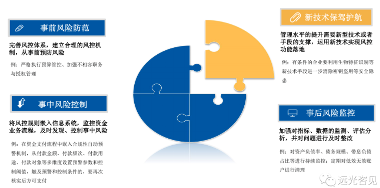 從信息化落地角度加強資金業(yè)務(wù)全面監(jiān)控,建議從四個維度展開:事前風險防范、事中風險控制、事后風險監(jiān)控、新技術(shù)保駕護航。