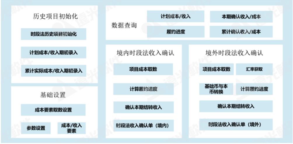 時(shí)段法收入核算系統(tǒng)包括“歷史項(xiàng)目初始化”、“基礎(chǔ)設(shè)置”、“境內(nèi)時(shí)段法收入確認(rèn)”、“境外時(shí)段法收入確認(rèn)”和“數(shù)據(jù)查詢”五個(gè)模塊,詳細(xì)見(jiàn)以下圖所示。