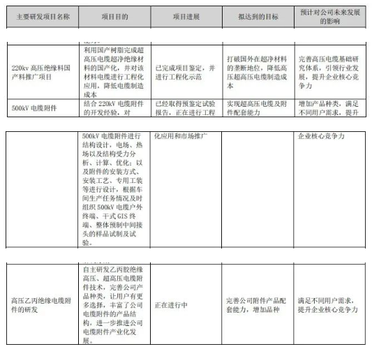 公司自主研發(fā)了 290/500kV 交聯(lián)聚乙烯絕緣電力電纜附件、±525kV(±535kV)交聯(lián)聚乙烯絕緣直流電纜附件、400kV 及以下電壓等級的直流電纜附件系列產(chǎn)品、高鐵專用 27.5 kV 產(chǎn)品和核電、風(fēng)電專用電纜附件產(chǎn)品、智能在線監(jiān)測系統(tǒng)等產(chǎn)品和配套系統(tǒng),并在國內(nèi)率先完成 500kV、220kV 和 110kV 系列高壓電纜附件產(chǎn)業(yè)化。公司近三年投入的研發(fā)費用平均占主營業(yè)務(wù)收入 5%以上,并在近年持續(xù)加大投入力度,有力支撐了新產(chǎn)品的持續(xù)研發(fā)能力。