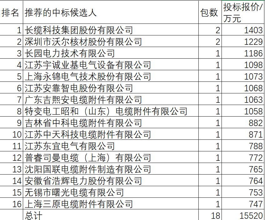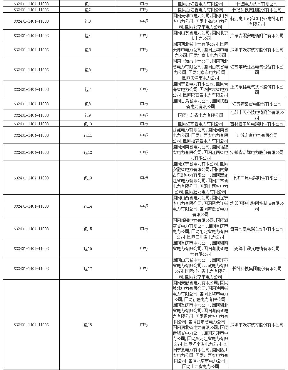 3月12日,國網(wǎng)公司電子商務(wù)平臺(ECP)網(wǎng)站發(fā)布國家電網(wǎng)有限公司2024年第一批采購(輸變電項(xiàng)目第一次變電設(shè)備(含電纜)招標(biāo)采購)中標(biāo)公告(招標(biāo)編號:0711-240TL00211001),其中分標(biāo) SG2404-1404-11003電纜附件共18包,有16家供應(yīng)商中標(biāo),具體見下圖。