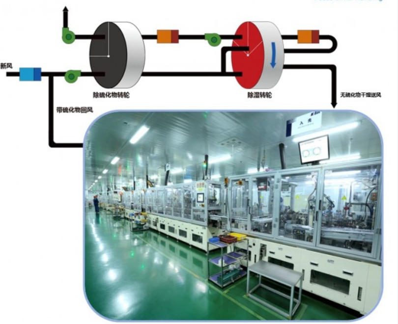 生產(chǎn)車間中濃度較低的H?S 氣體,會被除濕系統(tǒng)的負壓回風帶入除濕機內(nèi)部。該除濕機裝有活性炭過濾器/除硫轉(zhuǎn)輪,可先吸附硫化氫,再進行除濕。