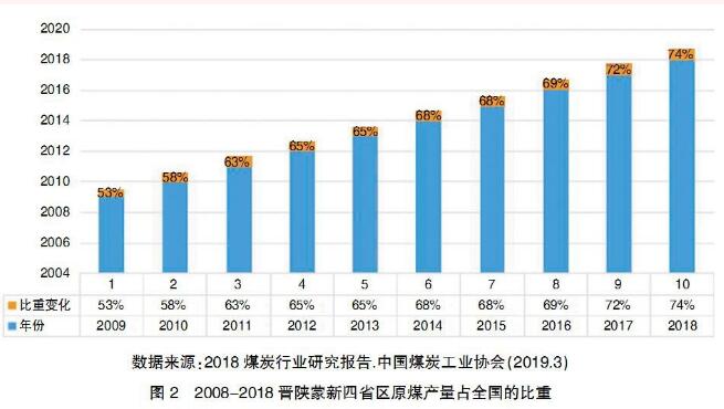 在供給側(cè)結(jié)構(gòu)性改革政策的推動(dòng)下,煤炭產(chǎn)能集中度進(jìn)一步提高。十八大以來,國務(wù)院相繼出臺(tái)了關(guān)于深化煤炭市場(chǎng)化改革的一系列文件,增大了煤炭去產(chǎn)能力度,截至到2018年底,基本上提前完成了“十三五”煤炭去產(chǎn)能8億噸的計(jì)劃,淘汰關(guān)閉了一大批不合標(biāo)準(zhǔn)的煤礦。同時(shí),為了滿足日益增長的能源市場(chǎng)需要,新建、擴(kuò)建、技改一批現(xiàn)代化礦井,產(chǎn)能已達(dá)到14.96億噸。據(jù)中國煤炭工業(yè)協(xié)會(huì)統(tǒng)計(jì),全國煤礦數(shù)量從2015年的1.08萬處減少到目前的5800處,年產(chǎn)能120萬噸及以上的大型煤礦產(chǎn)量超過80%,年產(chǎn)能30萬噸及以下小型煤礦減少至10%以下。煤炭開采向大型煤炭基地集中,其產(chǎn)量占全國總產(chǎn)量的95%以上,5000萬噸級(jí)以上大型礦井產(chǎn)量占60%以上。煤炭生產(chǎn)布局進(jìn)一步向晉、陜、蒙、新地區(qū)等地區(qū)集中。2018年,內(nèi)蒙古、山西、陜西、新疆、貴州、山東、河南、安徽等8個(gè)億噸級(jí)規(guī)模以上企業(yè)原煤產(chǎn)量達(dá)31.2億噸,占全國的88.1%,其中,晉、陜、蒙、新四省(區(qū))原煤產(chǎn)量占全國的74.3%。見圖1、圖2。