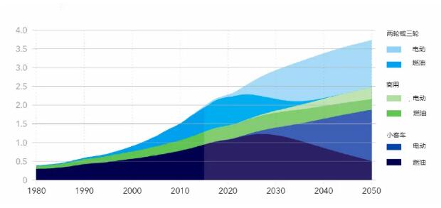 圖:全球不同類型和動(dòng)力系統(tǒng)的路面交通工具數(shù)量統(tǒng)計(jì)(單位:百萬輛)
