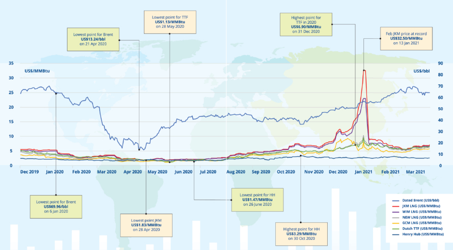 受疫情影響,2020年全球油氣供需嚴(yán)重失調(diào),不僅WTI創(chuàng)造了歷史性的“負(fù)油價(jià)”,全球天然氣價(jià)格也緊隨其后,降至近十年來最低點(diǎn)。一直飽受“亞洲溢價(jià)”困擾的JKM定價(jià)與同期歐美氣價(jià)幾乎持平,最低至1.83美元/MMBtu。