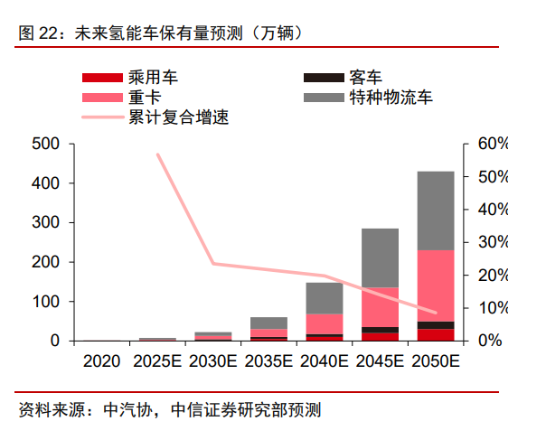 我們預(yù)計(jì)隨著氫能車的降本疊加經(jīng)濟(jì)的恢復(fù),2023年銷量或超過9000輛,其中大型客車及大型卡車銷量分別為1250、2000輛左右;輕型貨車或物流車由于種類多、應(yīng)用場景豐富,依然是銷量最多的車型,預(yù)計(jì)銷量接近6000輛。